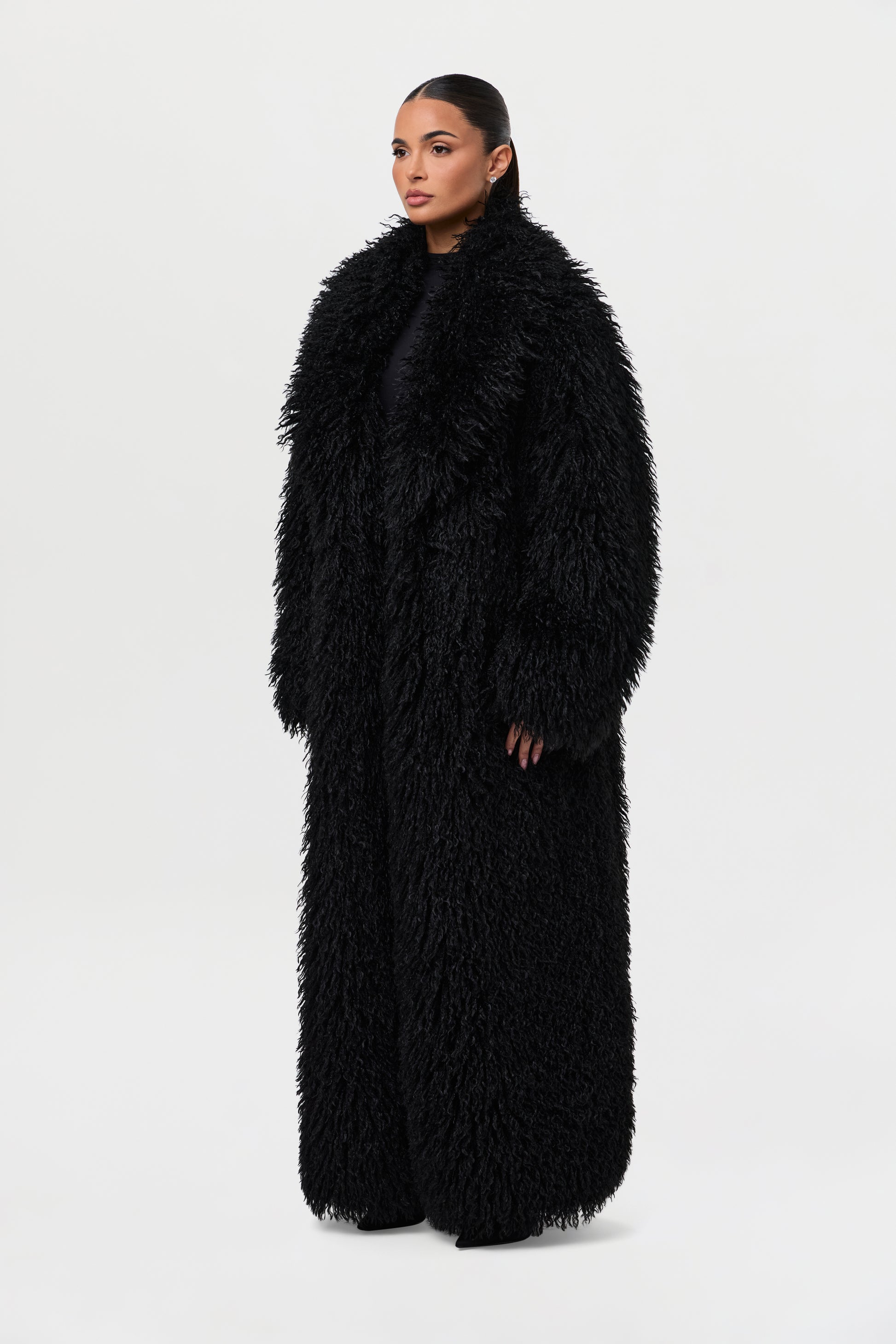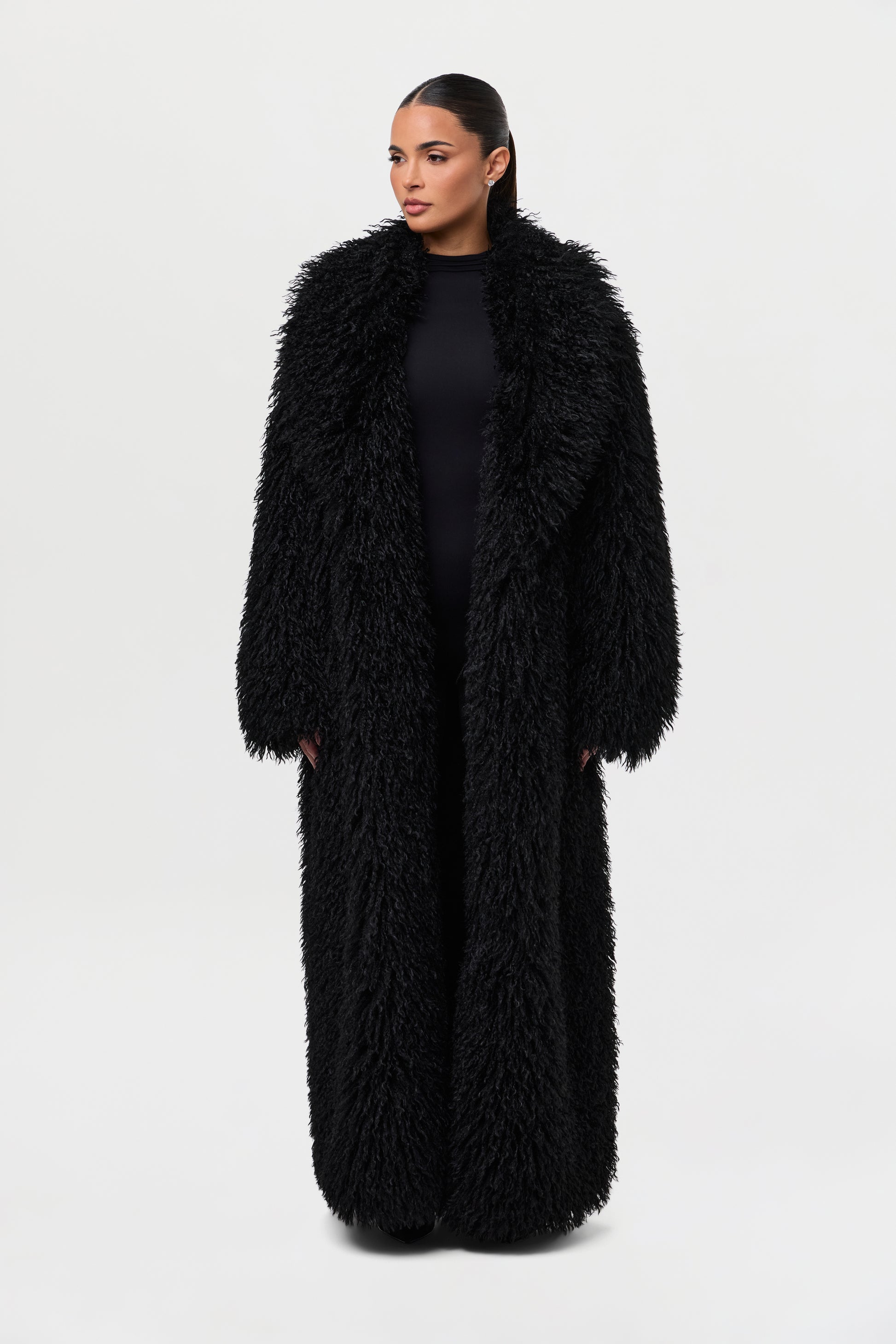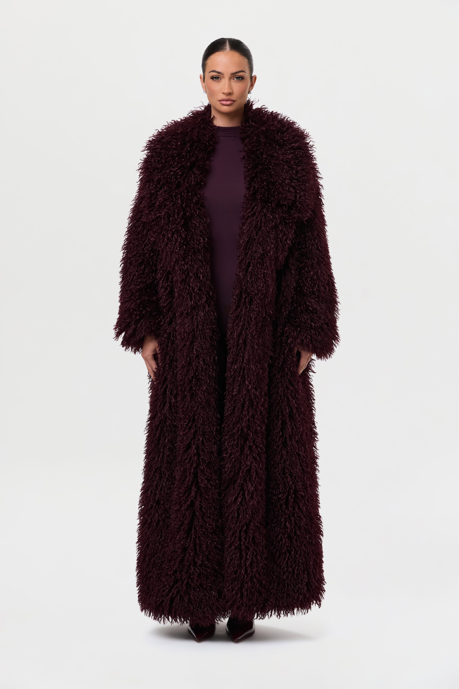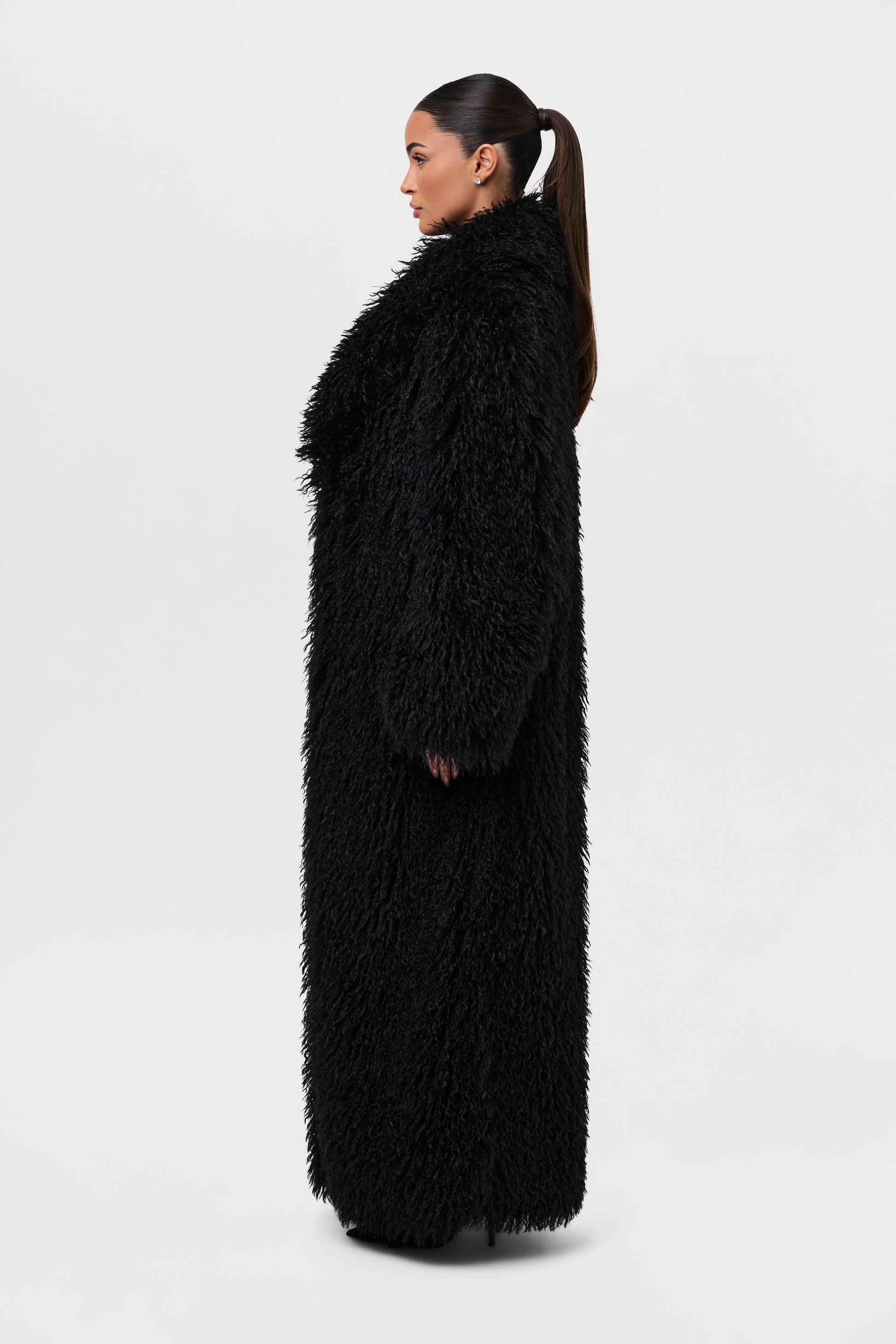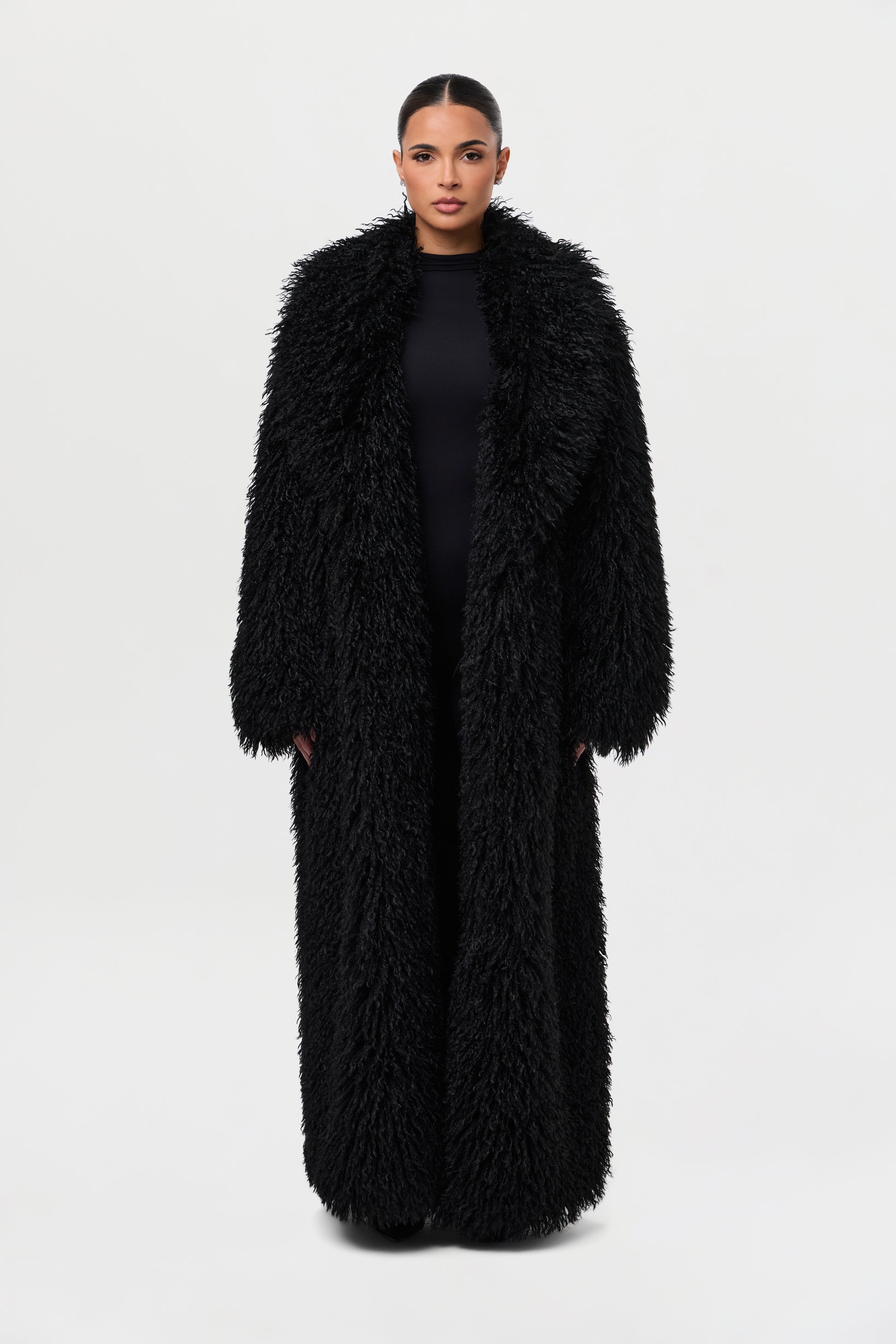 Our runway inspired and fashion forward plush long coat is constructed with an opulent Mongolian faux fur texture that demands luxury. Front pockets add to the details. From Paris to New York and every fancy occasion, this coat will be the staple of the season.