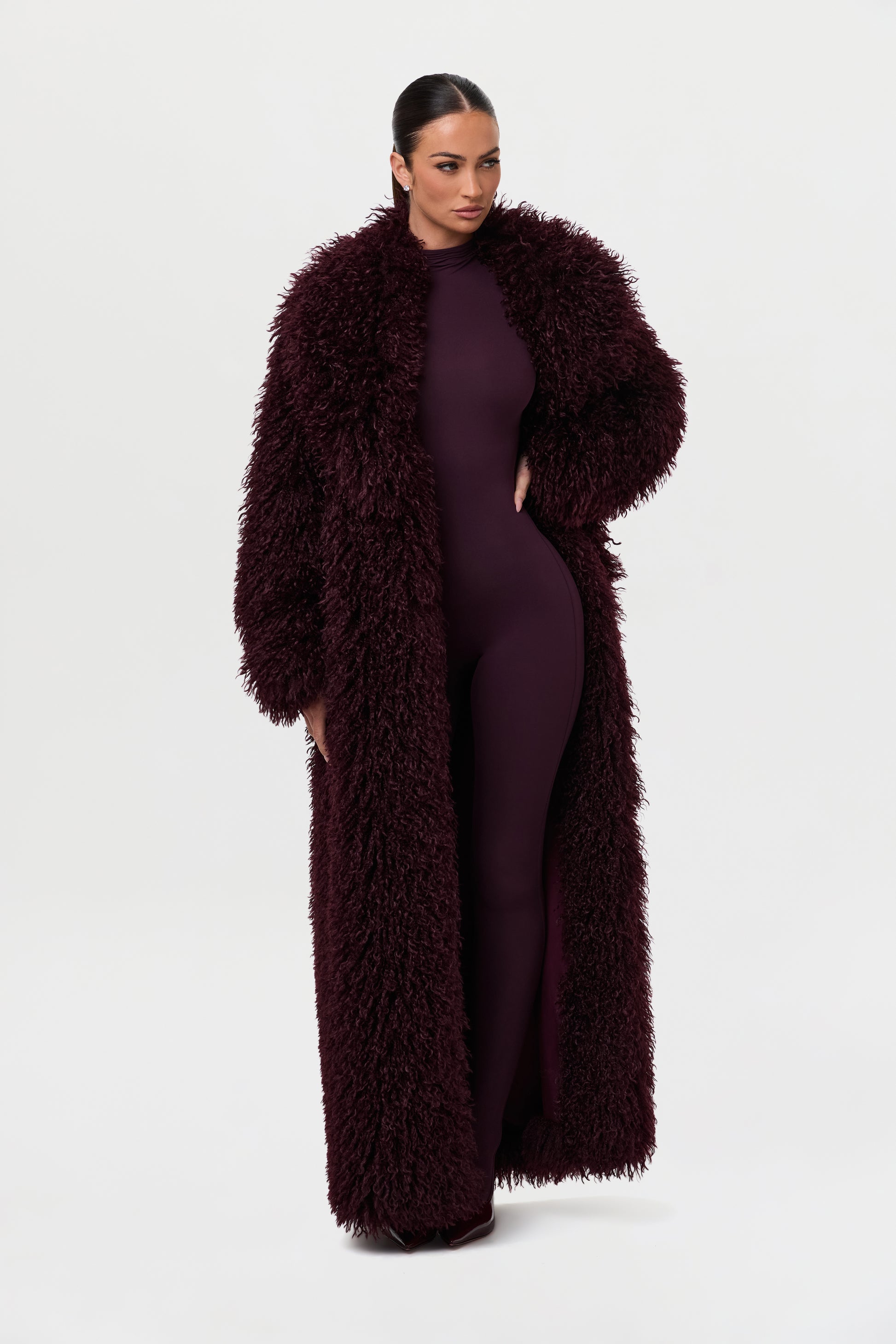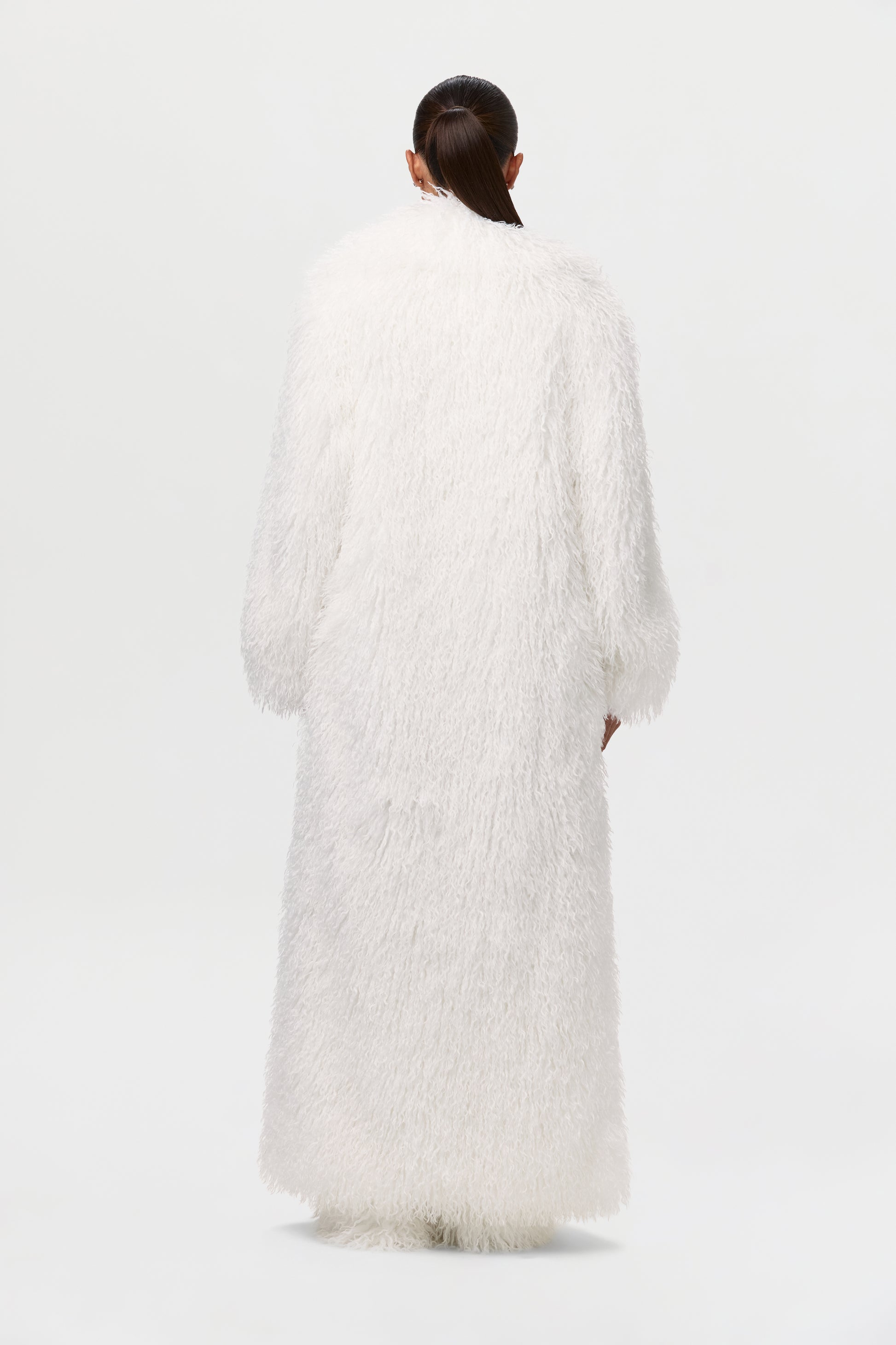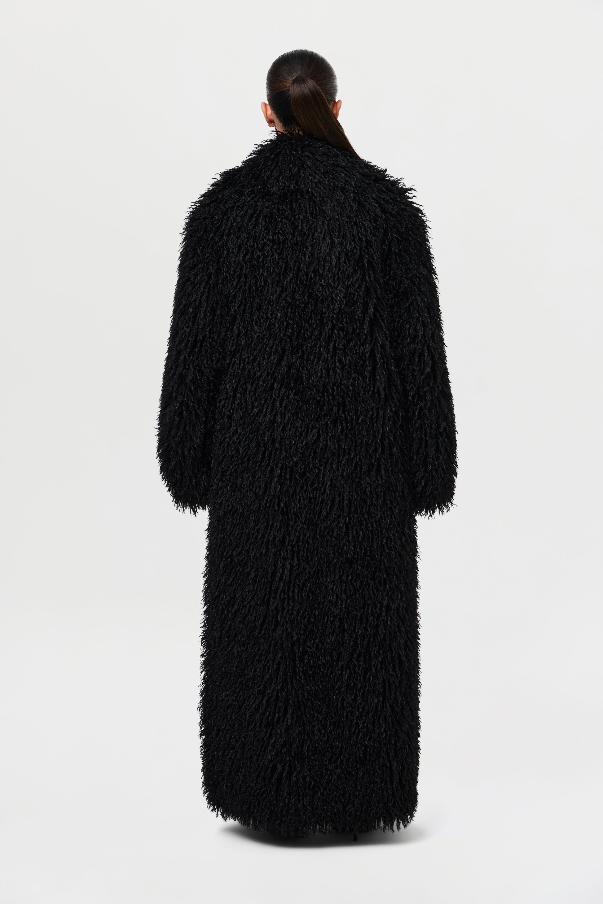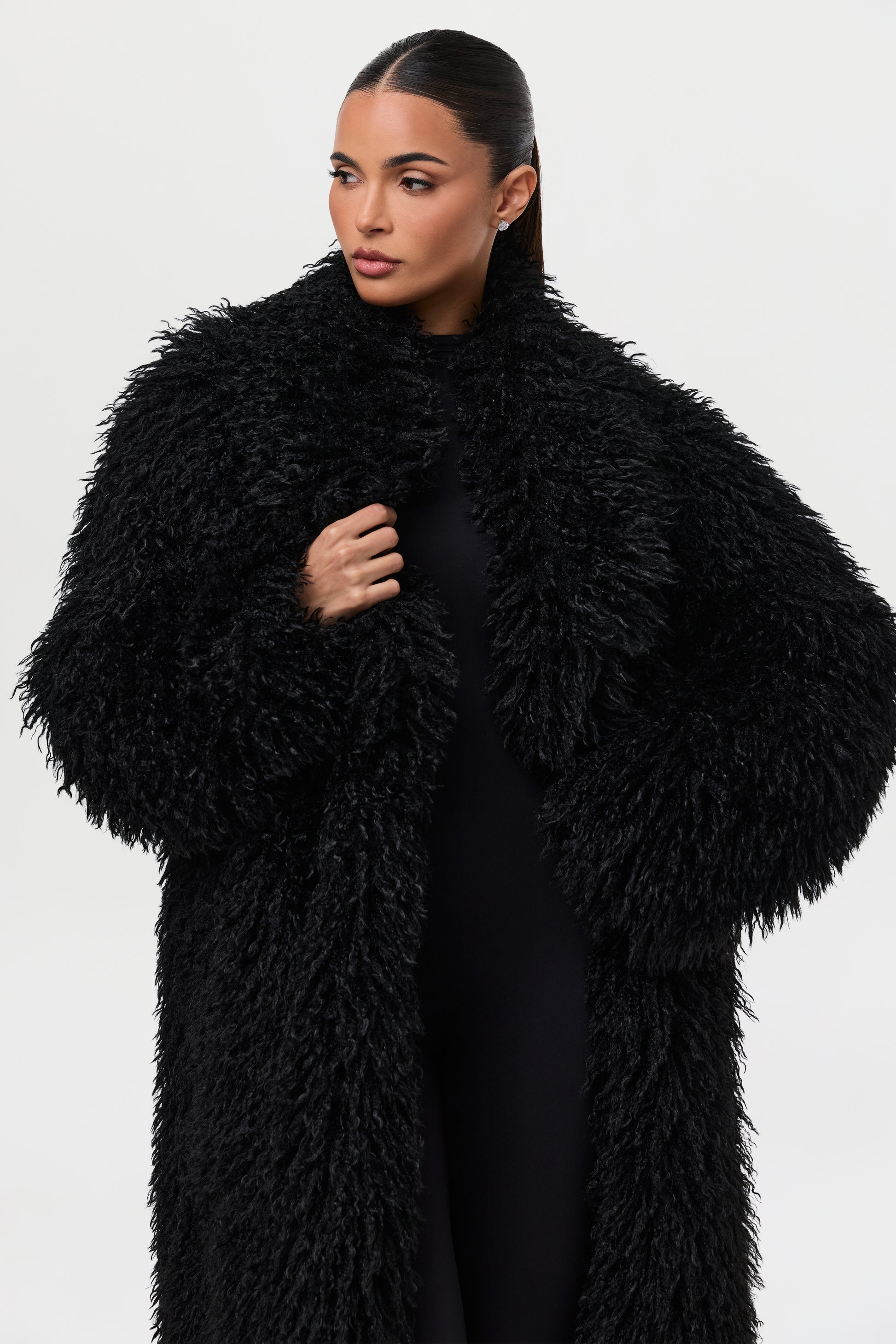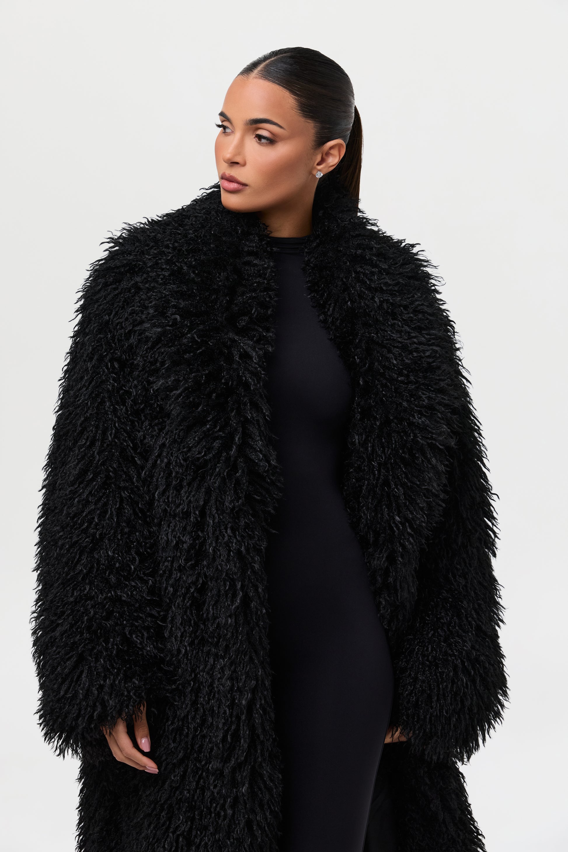 Our runway inspired and fashion forward plush long coat is constructed with an opulent Mongolian faux fur texture that demands luxury. Front pockets add to the details. From Paris to New York and every fancy occasion, this coat will be the staple of the season.