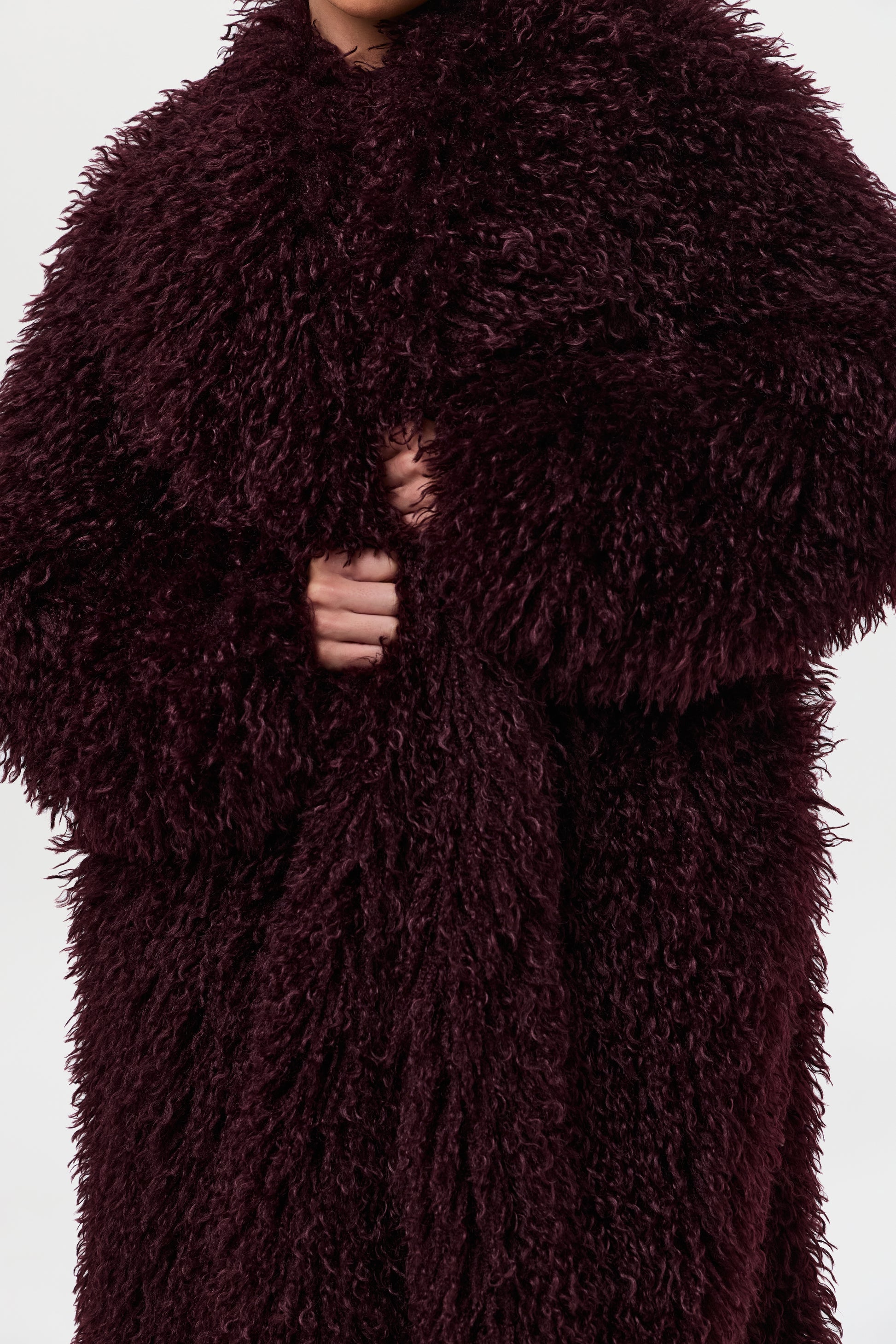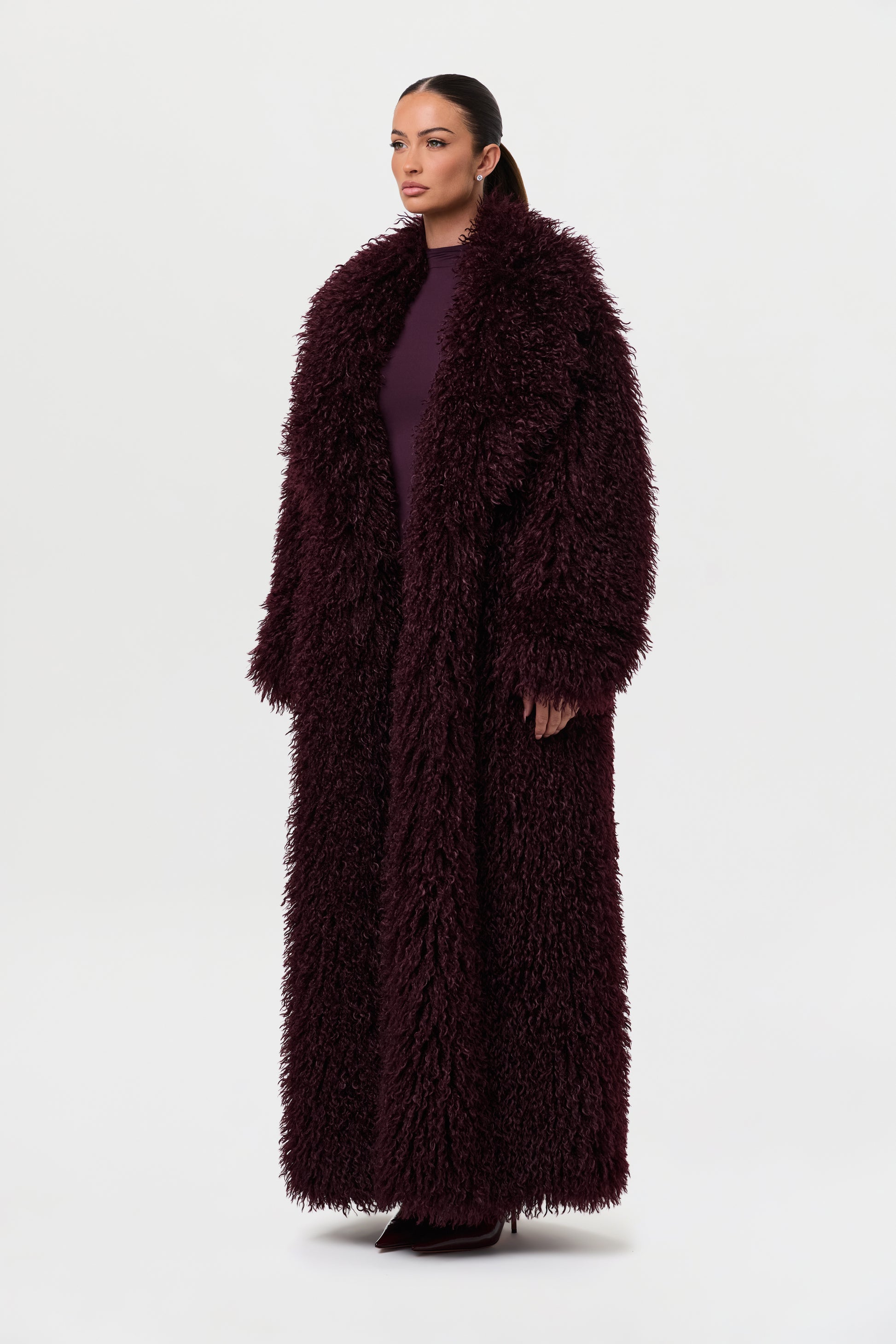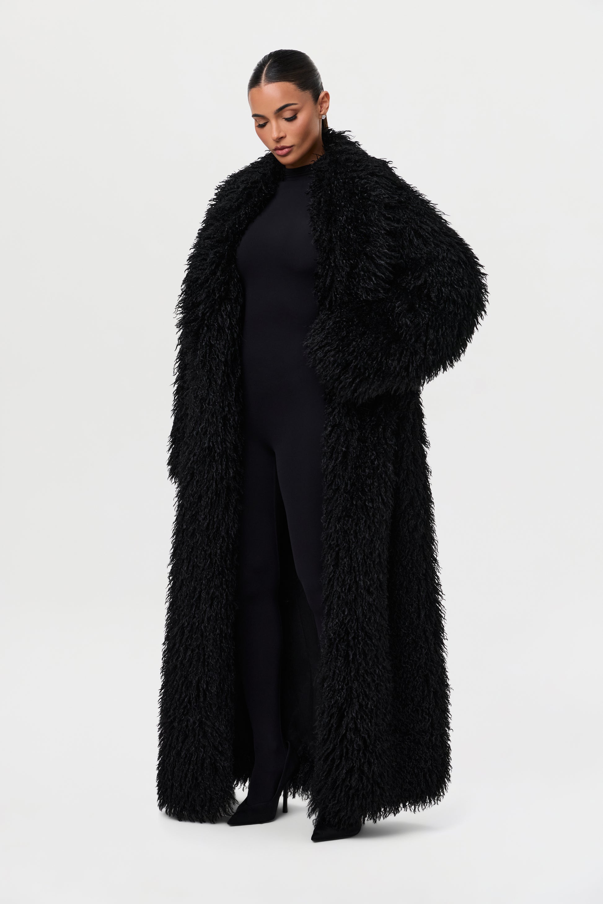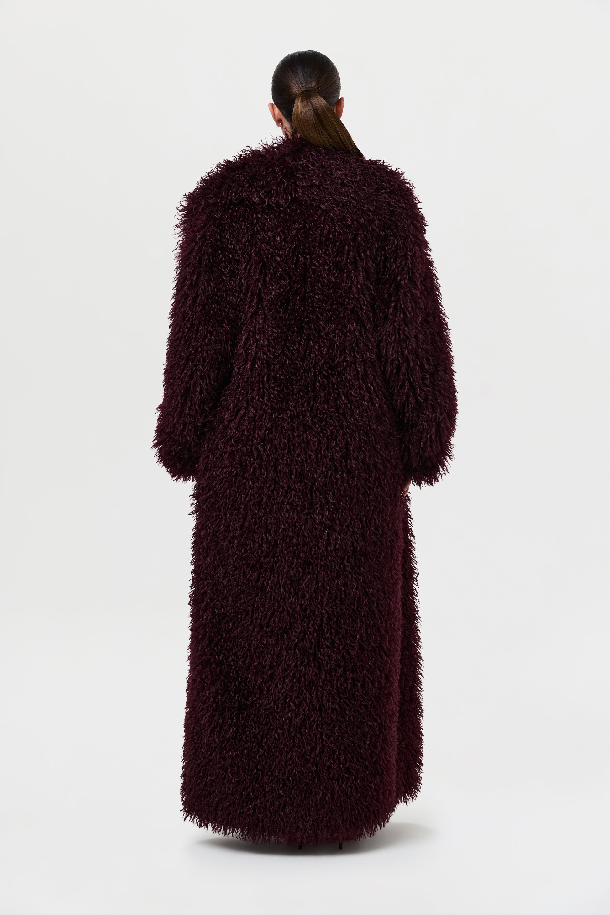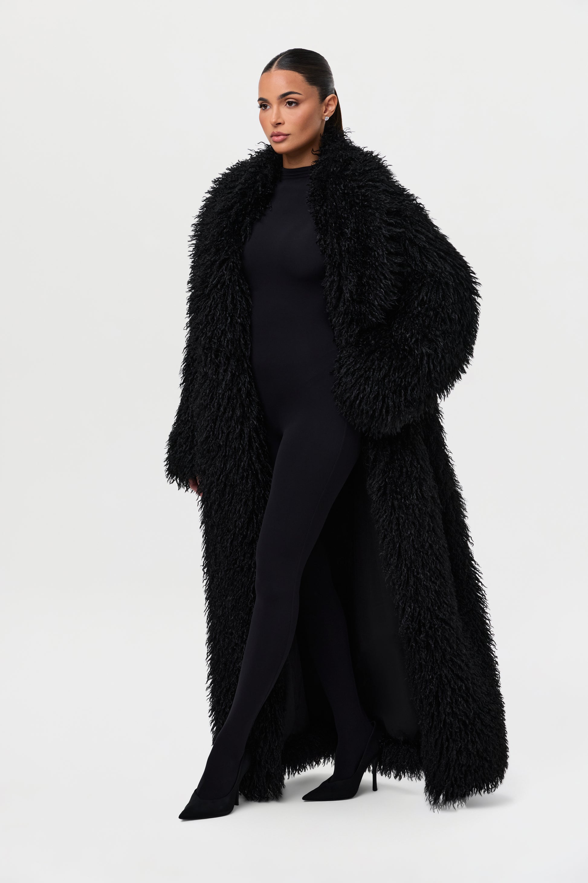Our runway inspired and fashion forward plush long coat is constructed with an opulent Mongolian faux fur texture that demands luxury. Front pockets add to the details. From Paris to New York and every fancy occasion, this coat will be the staple of the season.