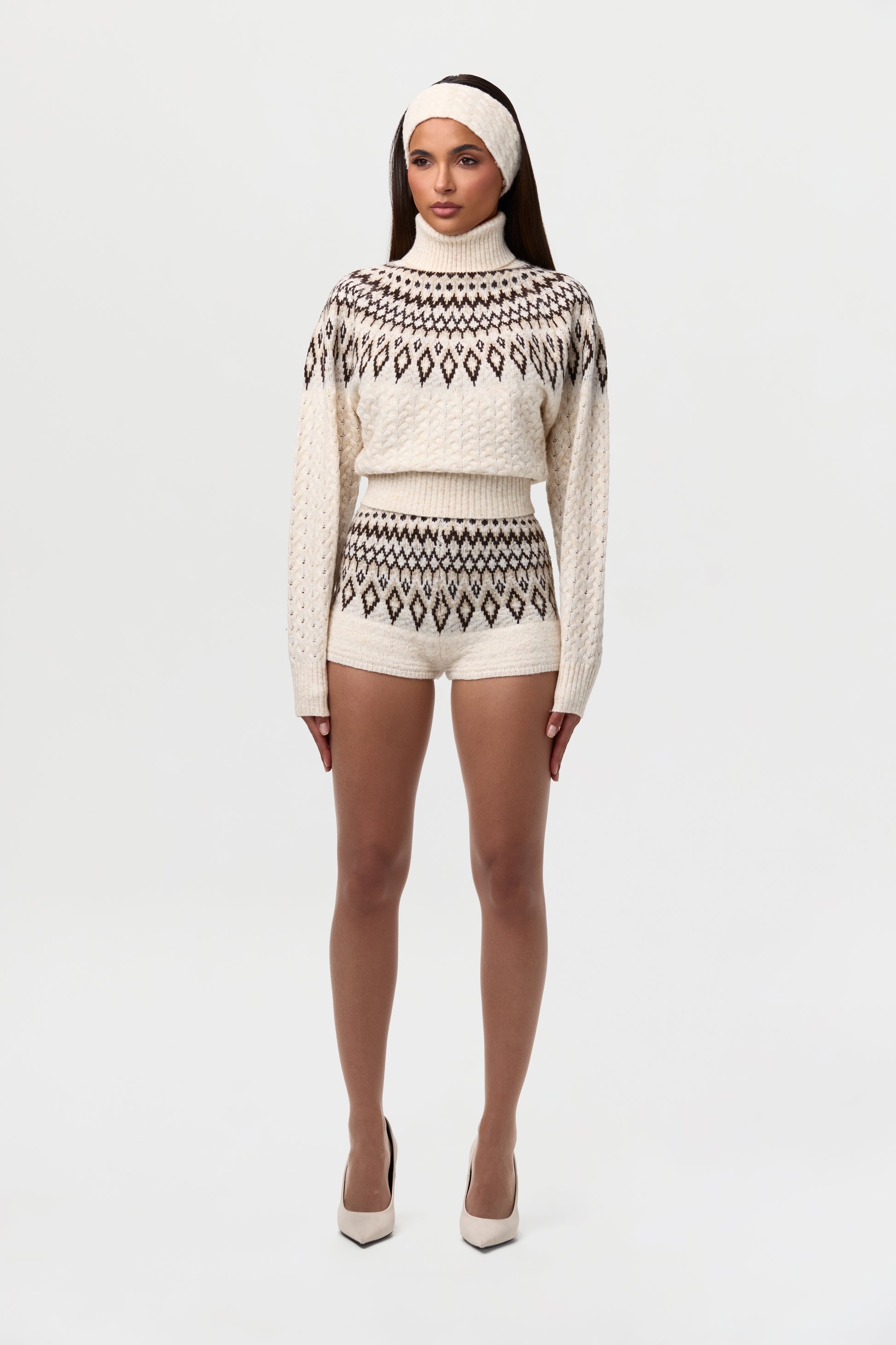 Stay Fall ready with our textured Fair Isle hot pants. Crafted with an elasticized high ribbed waistband, an intricate pattern throughout, and ribbed trim and hem. Style with our matching sweater to complete the co-ord look.