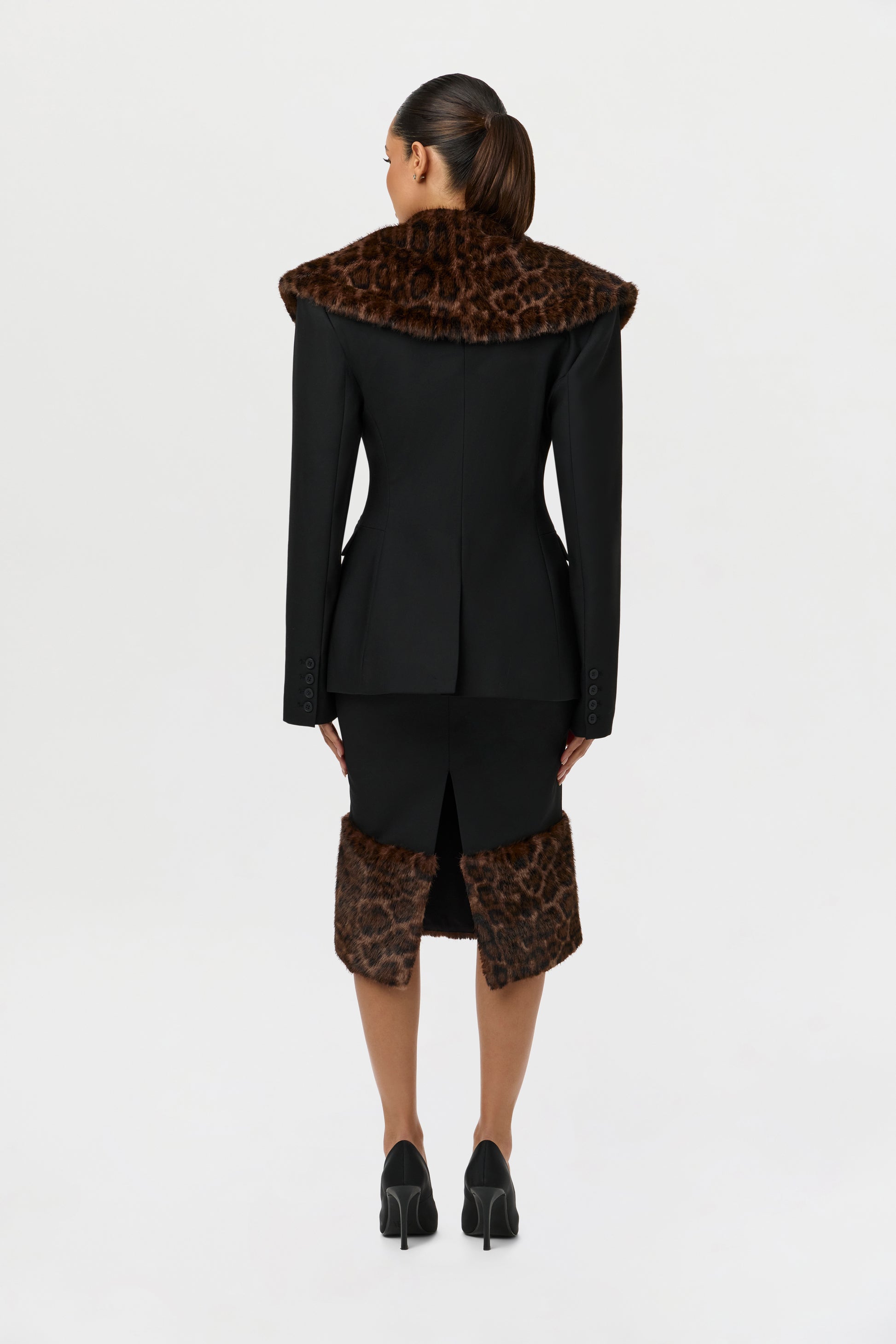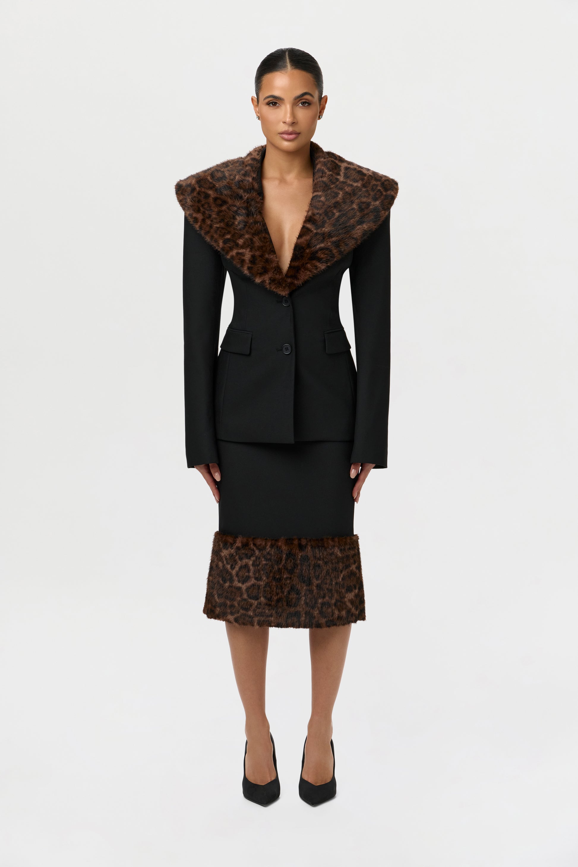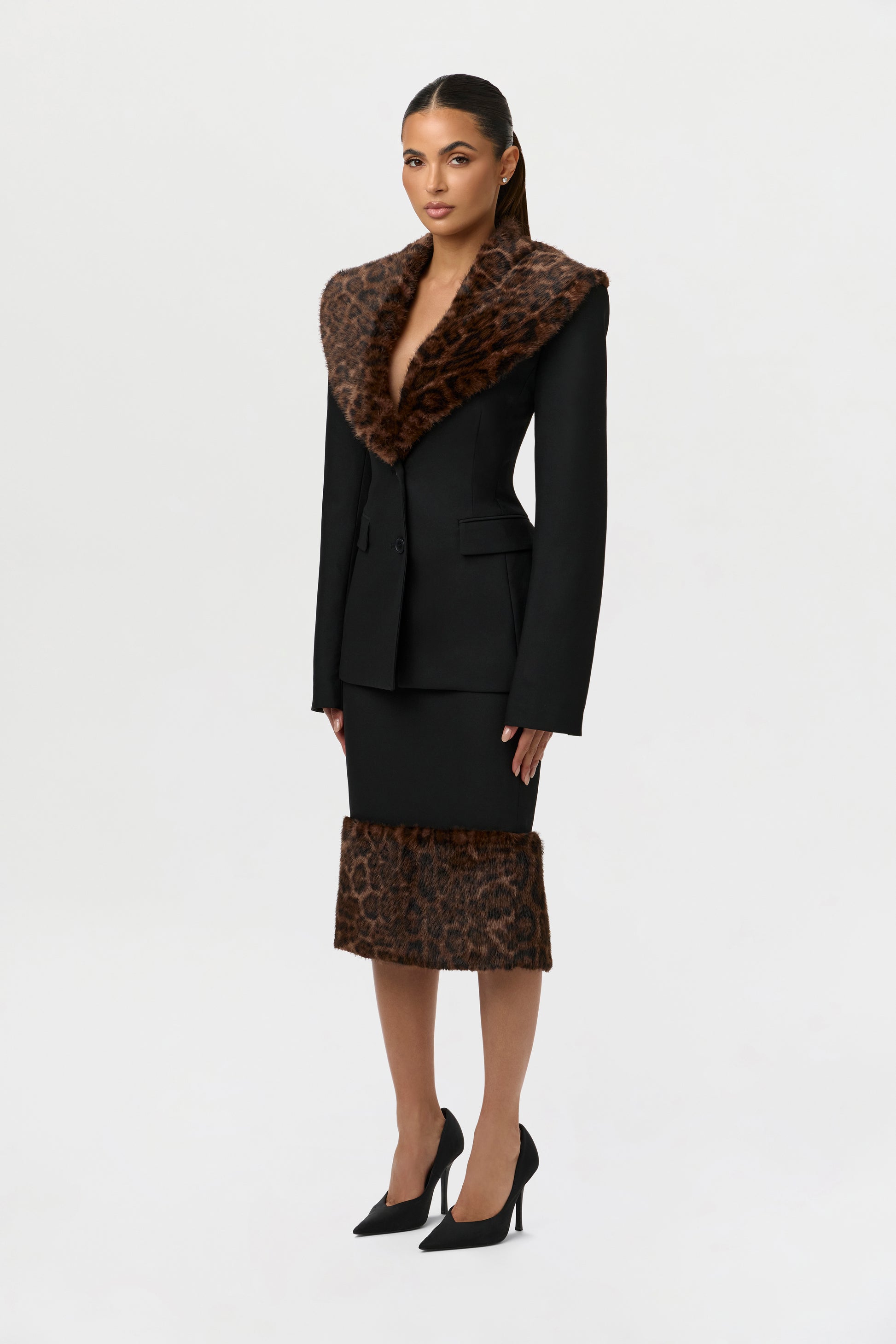 Elevate your bosswear with our statement midi skirt. Crafted with a  body-hugging silhouette to accentuate your figure, and a plush faux fur leopard panel along the hem. The contrast texture adds richness and dimension while keeping the look modern and refined. Style with our matching blazer to create a cohesive, high-impact moment.